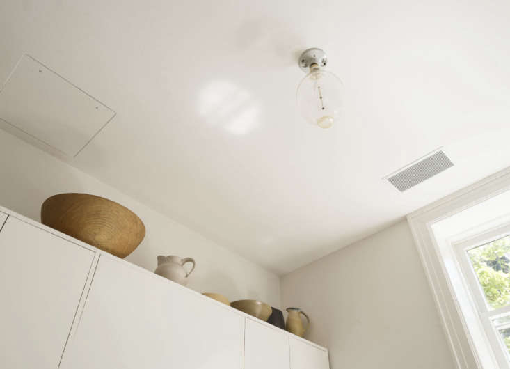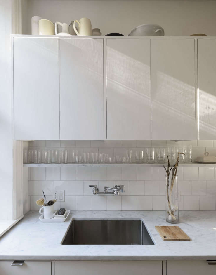Above: We turned to Brooklyn-based Jeremy Pickett of Pickett Furniture (one of our earliest Remodelista advertisers, back in the late aughts) for the minimally detailed cabinets. The countertops are Carrara marble. (For countertop guidance, see our post Remodeling 101: The Difference Between Carrara, Calacatta, and Statuary Marble.) A repurposed florist vase holds stalks of garlic from the farmer’s market (I was inspired by David Tanis’ kitchen storage ideas).