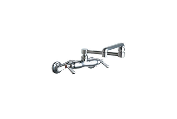 Above: The Chicago Faucets Wall-Mounted Adjustable Center Kitchen Faucet has an articulated spout, is well-priced, well-engineered, and offers a classic lab aesthetic; $265.82 at Consumers Plumbing. For more ideas, see 10 Easy Pieces: Wall-Mounted Industrial Faucets.